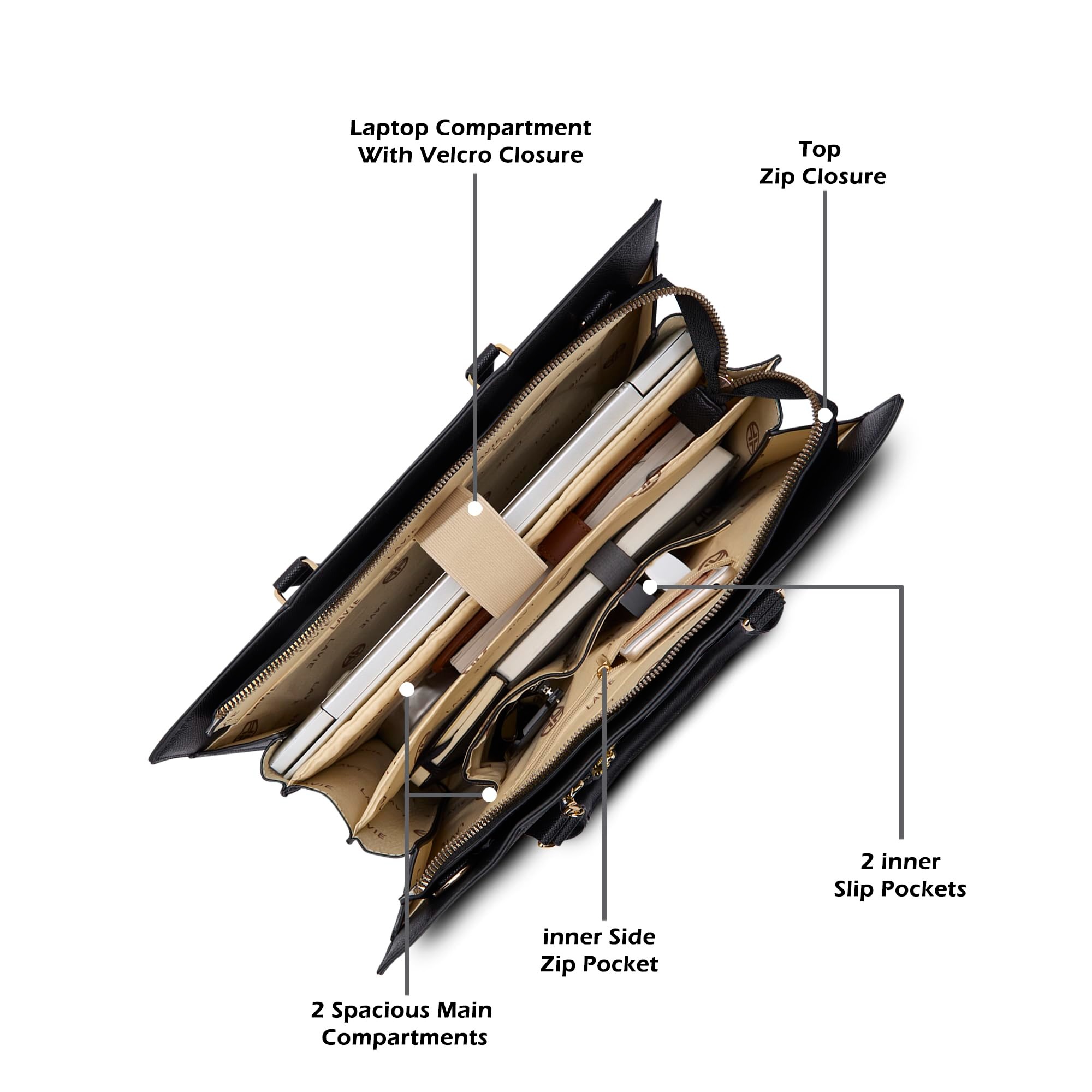 • There are several storage possibilities for items like phones, portable chargers, keys, wallets, hairbrushes, sunglasses, and so on thanks to the compartments, one slide pocket, and one zip pocket.